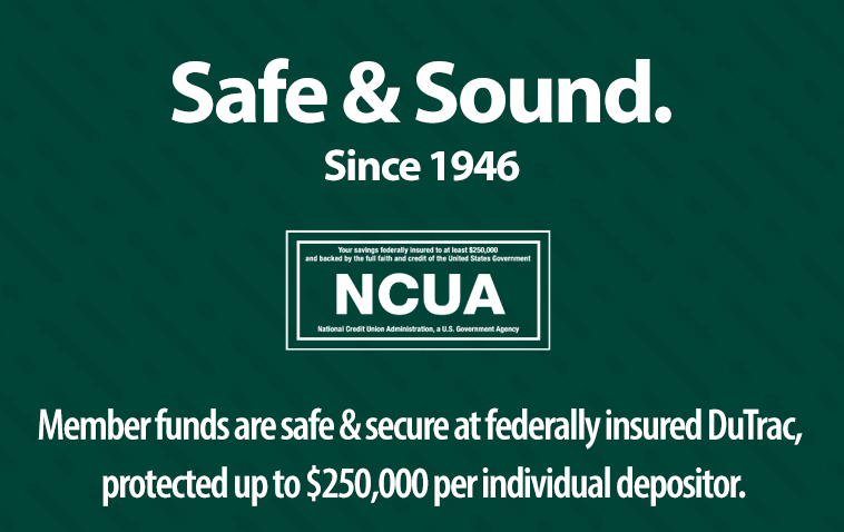Again, your money is safe and secure at our credit union, and protected up to $250,000 per individual depositor. You may qualify for additional coverage if you own share accounts in different categories. Examples would be joint accounts, retirement accounts or revocable trusts. Please visit DuTrac.org or call 563-582-1331 with questions.